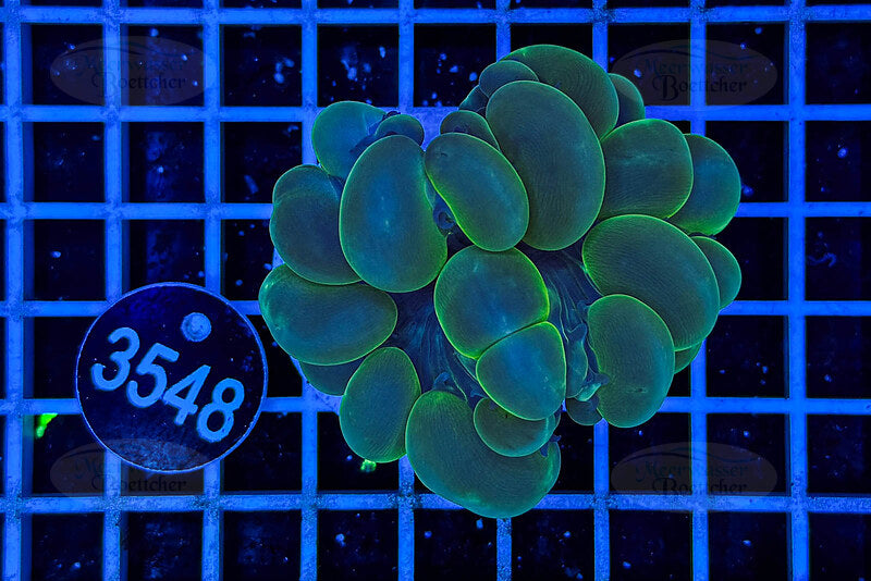 This Plerogyra – also known as Bubble Coral – is an exceptional LPS coral that immediately catches the eye with its balloon-like, shimmering, transparent bubbles. Under blue light, the "bubbles" exhibit an impressive fluorescence that is particularly striking in modern reef LED aquariums. Plerogyra often displays white, green, and turquoise hues, sometimes with a metallic sheen.