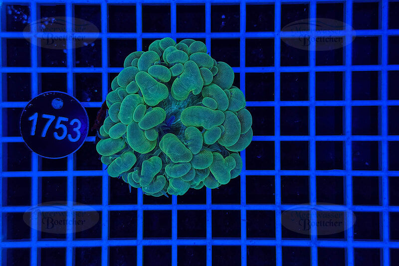 This Plerogyra , also known as Bubble Coral , is an exceptional and voluminous LPS coral that captivates with its balloon-like, shimmering, transparent bubbles. The "bubbles" create a unique, soft appearance and fluoresce particularly impressively under blue light. Plerogyra often displays white, green, turquoise, or slightly metallic tones.