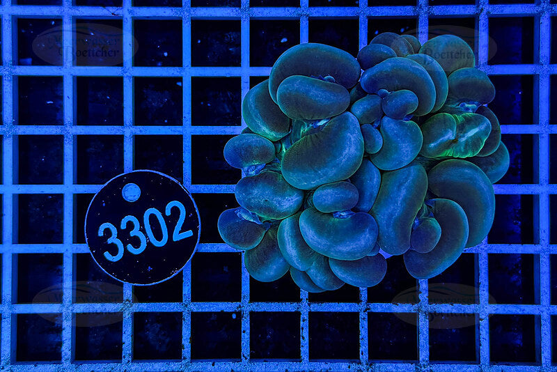 This Plerogyra – also known as Bubble Coral – is an exceptional LPS coral that immediately catches the eye with its balloon-like, shimmering, transparent bubbles. Under blue light, the "bubbles" exhibit an impressive fluorescence that is particularly striking in modern reef LED aquariums. Plerogyra often displays white, green, and turquoise hues, sometimes with a metallic sheen.