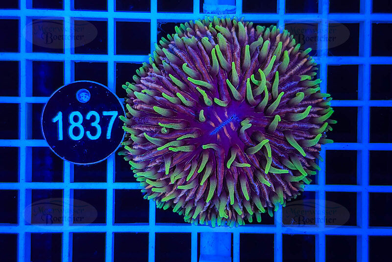 Ce corail Fungia , également appelé corail plat ou corail champignon , est un corail solitaire spectaculaire qui attire immédiatement le regard par sa forme ronde et discoïde et ses couleurs intenses. Le Fungia présente une forte fluorescence sous lumière bleue et compte parmi les coraux LPS les plus impressionnants pour le fond de l'aquarium.