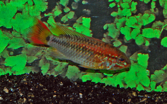 Der Rotflossen Zwergbuntbarsch frisst Frost- und Lebendfutter wie Artemia, Cyclops, Daphnien und Mückenlarven besonders gern. Hochwertiges Granulat- oder Flockenfutter wird ebenfalls akzeptiert. Eine abwechslungsreiche Ernährung fördert die intensive Rotfärbung und das Wohlbefinden.