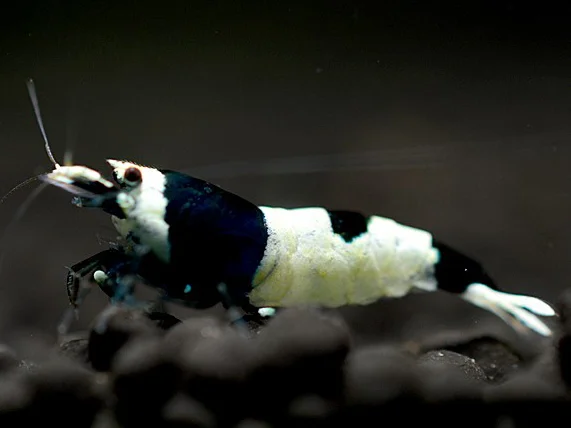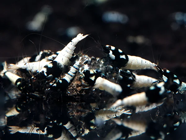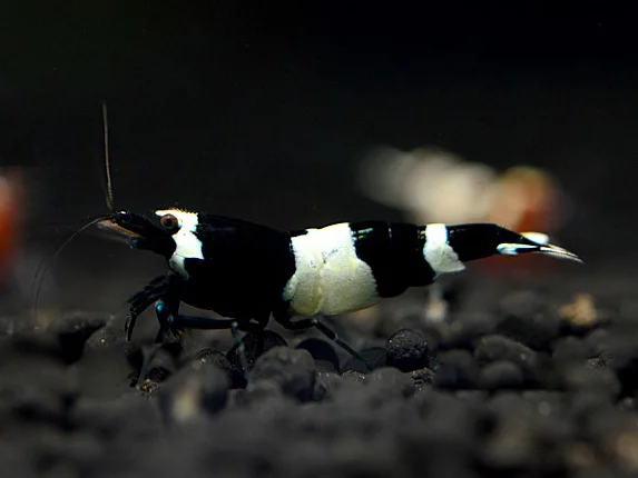 - Färbung: Diese Garnele zeichnet sich durch ihre markanten schwarzen und weißen Farbbänder aus. Je nach Zuchtform können die schwarzen Bereiche tiefschwarz und glänzend sein, während die weißen Partien kräftig und klar leuchten.
