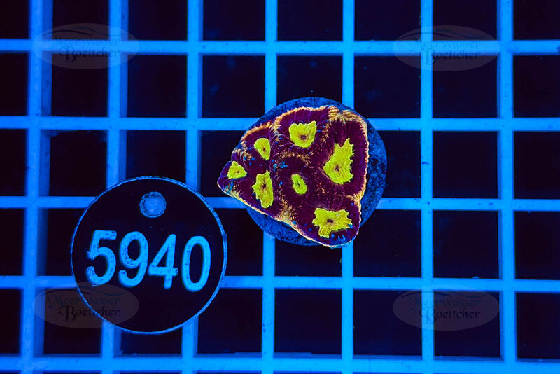 Das Originalfoto wurde unter 100 % Blaulicht mit Filter aufgenommen, sodass die natürliche Fluoreszenz, Leuchtkraft und Farbtiefe der Koralle absolut realitätsgetreu abgebildet werden. Die Farben wirken in typischen Reef-LED-Setups genauso intensiv und klar wie auf dem Bild.