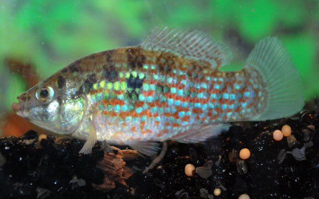 Der Floridakärpfling (Jordanella floridae) ist ein farbenfroher, lebhafter Fisch aus den Süßgewässern Floridas. Er beeindruckt durch seine bläulich-grüne Grundfärbung, goldene Glanzschuppen und die rot-orange gesäumten Flossen. Besonders in der Paarungszeit zeigt er intensive Farben, die ihn zu einem echten Blickfang machen.