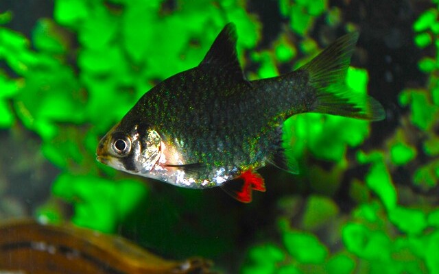 Die Sumatrabarbe Grün (Puntigrus tetrazona Green) ist eine faszinierende Farbvariante der bekannten Sumatrabarbe und begeistert mit ihrem tiefgrünen bis türkis schimmernden Körper, der je nach Lichteinfall metallisch glänzt. In Kombination mit den leuchtend roten Flossen entsteht ein besonders kontrastreiches und lebendiges Erscheinungsbild.